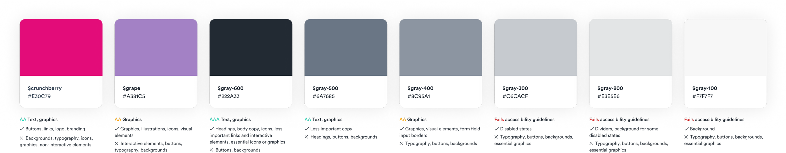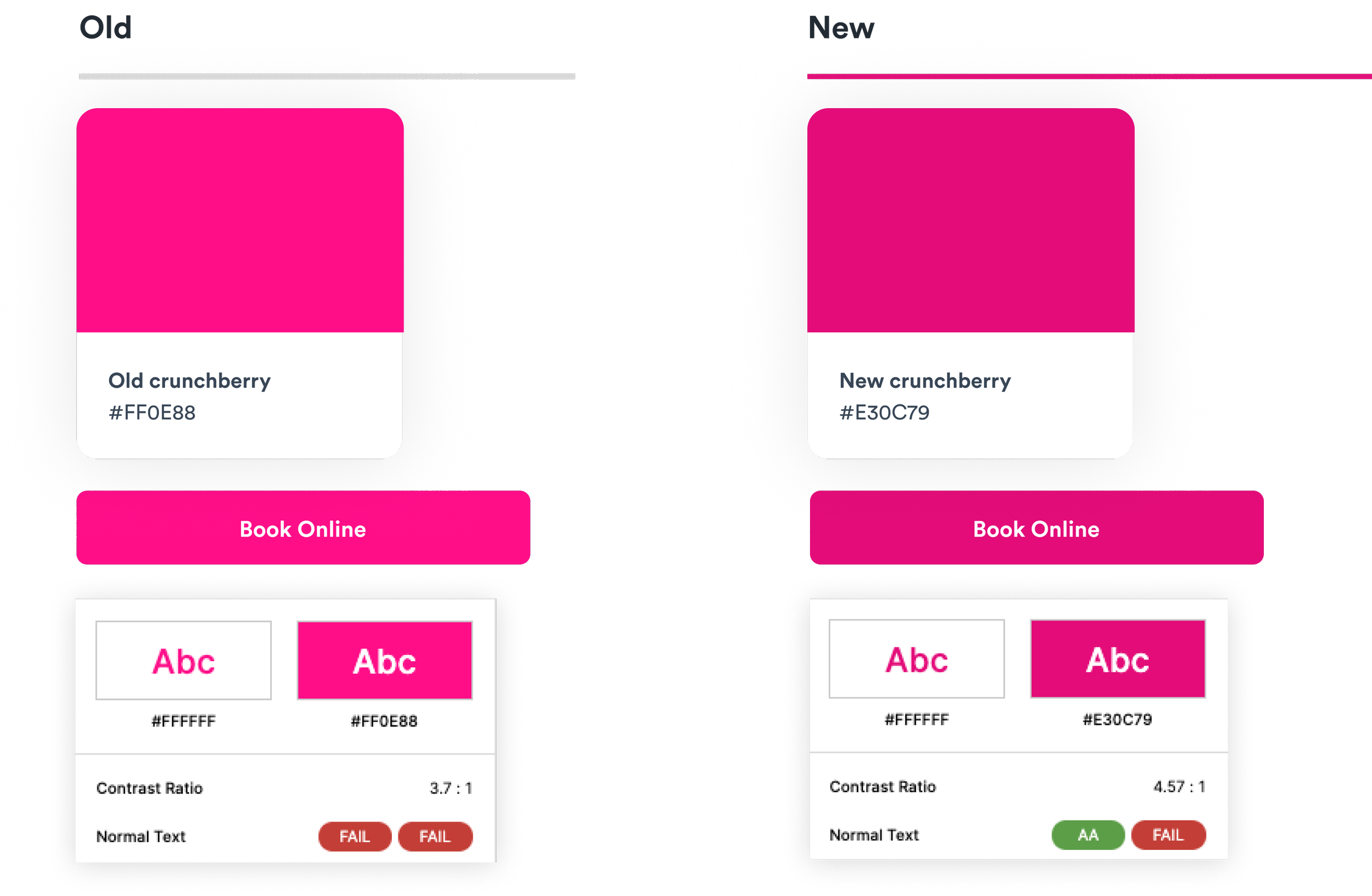 We started with foundational elements of typography, colors, spacing, and buttons. I audited and refined our colors to ensure they would be functional, warm, and accessible. I changed our primary brand color to meet minimum contrast guidelines and selected a dark gray for increased contrast optimized for body text.