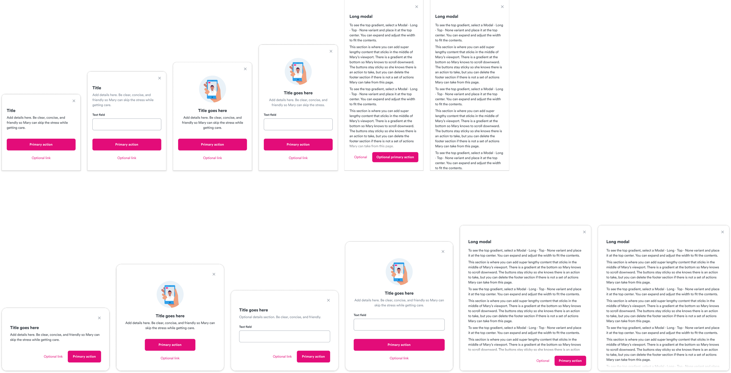 I asked my design teammate to fine-tune a select set of Streamline icons and our freelance marketing designer to gather spot illustrations so we could add them into compound components (like form fields, choice cards, or eventually, modals).